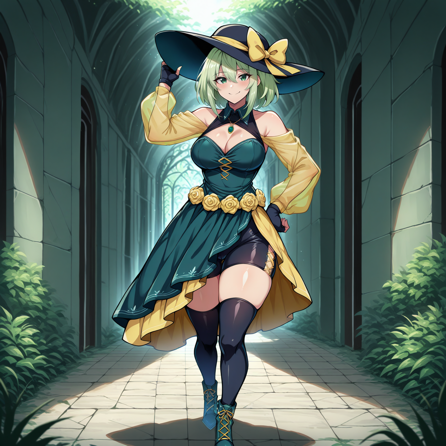 wide brim, cloche hat, black hat, hat bow, yellow bow, hat ribbon, yellow ribbon, fashion, dark green dress, bare shoulders, cleavage, collared dress, black pendant, pendant collar, yellow sleeves, translucent sleeves, black gloves, fingerless gloves, yellow flower, floral belt, yellow skirt, asymmetrical dress, asymmetrical skirt, black thighhighs, green high heel boots, lace-up heels