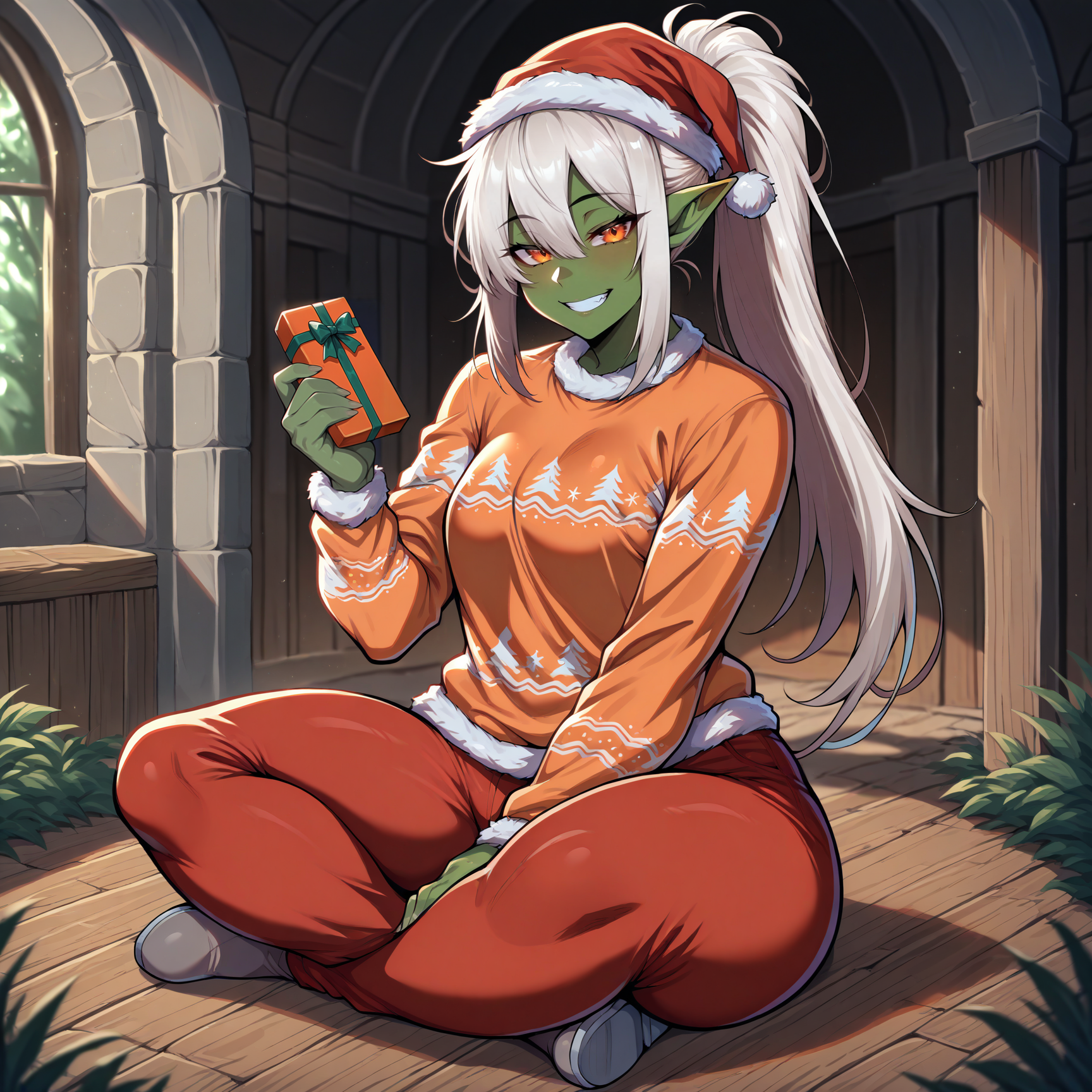 orange sweater, santa hat, christmas sweater, red pants, grey boots