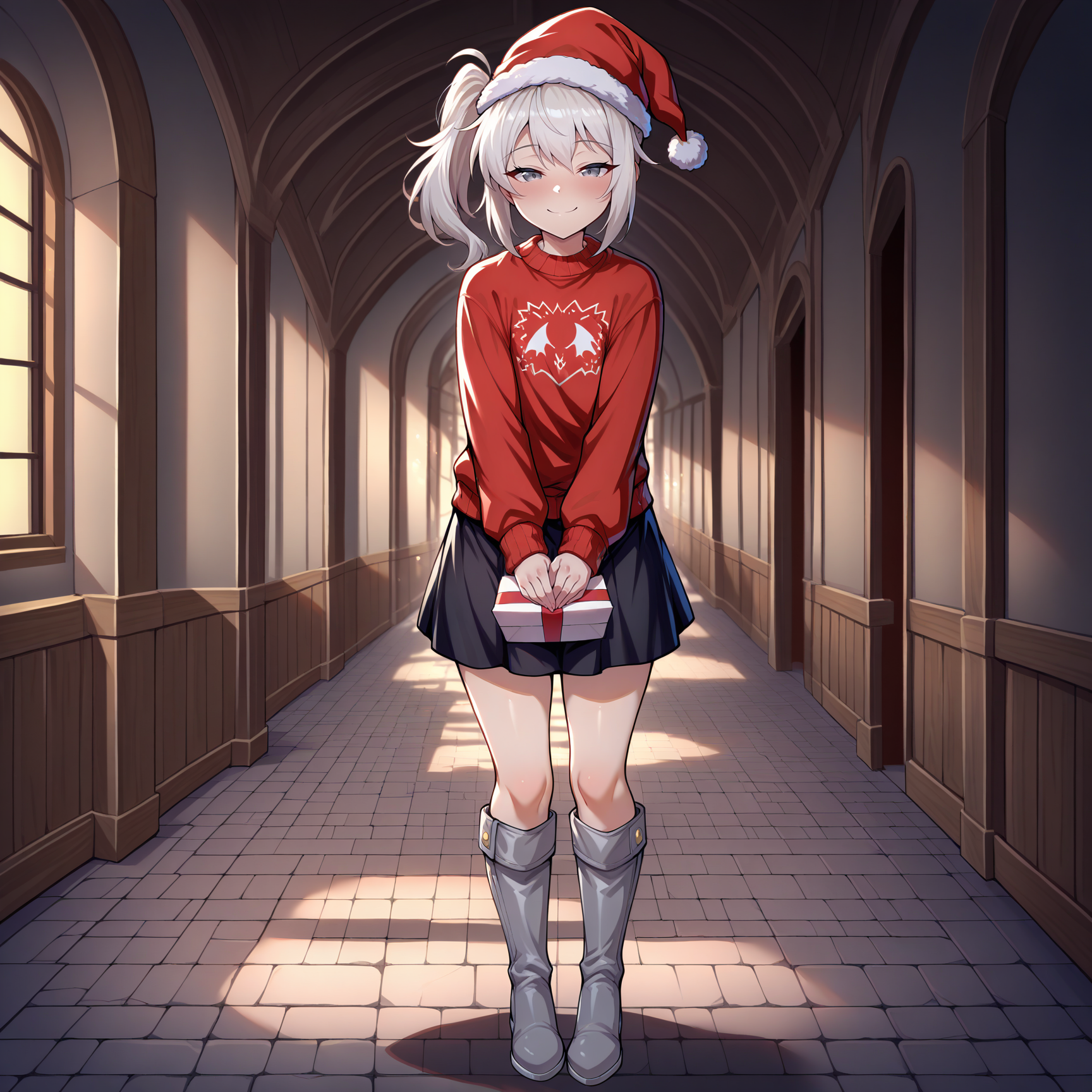 Outfit Prompts red sweater, santa hat, christmas sweater, black skirt, grey boots, knee boots