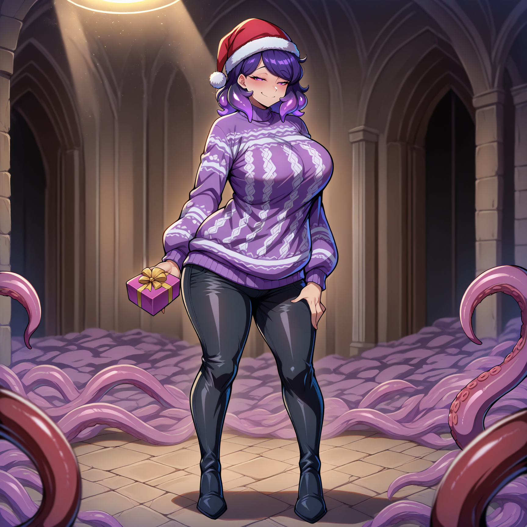 Outfit Prompts purple sweater, santa hat, christmas sweater, tentacles, tentacles under clothes, black pants, black boots