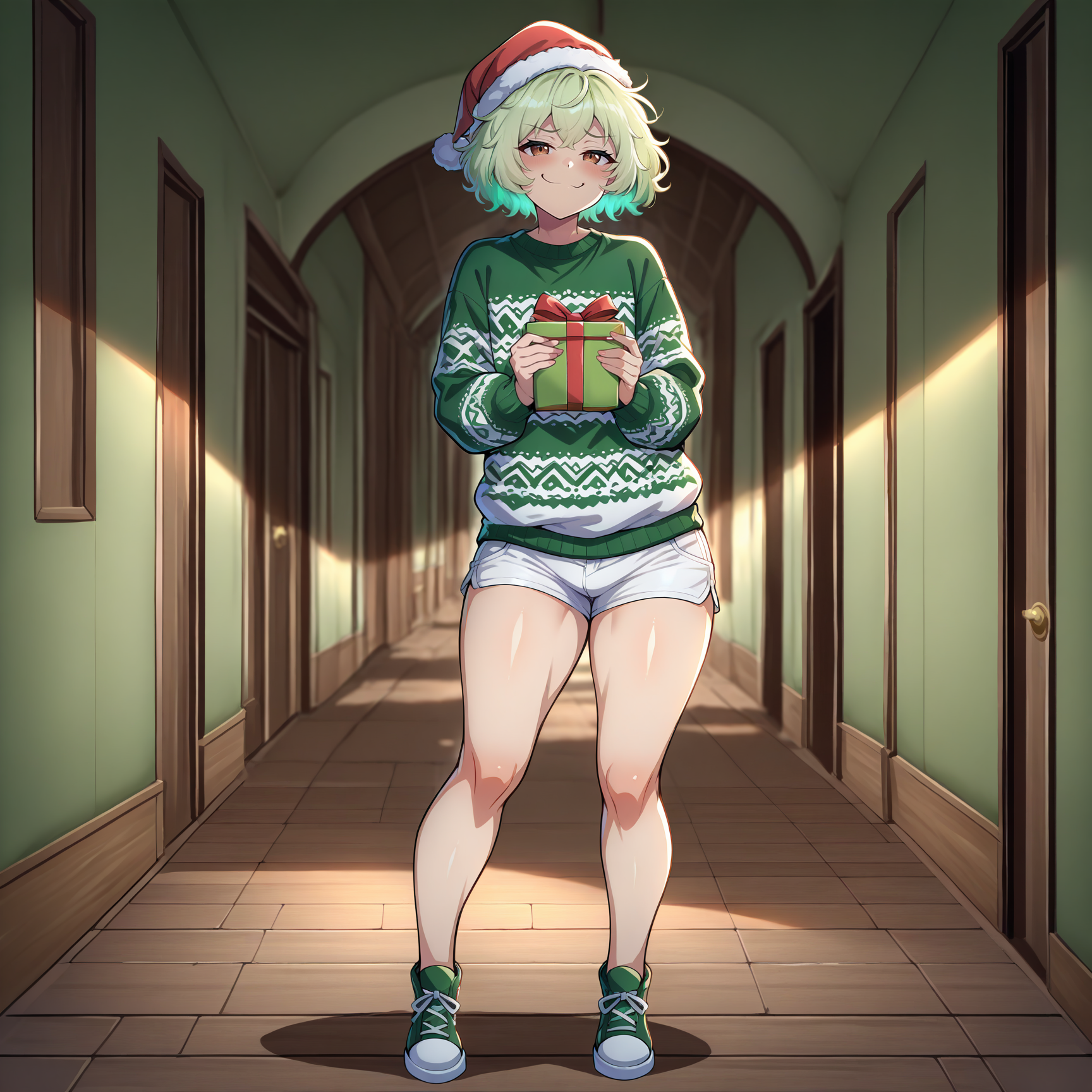 Outfit Prompts green sweater, santa hat, christmas sweater, white shorts, dark green shoes