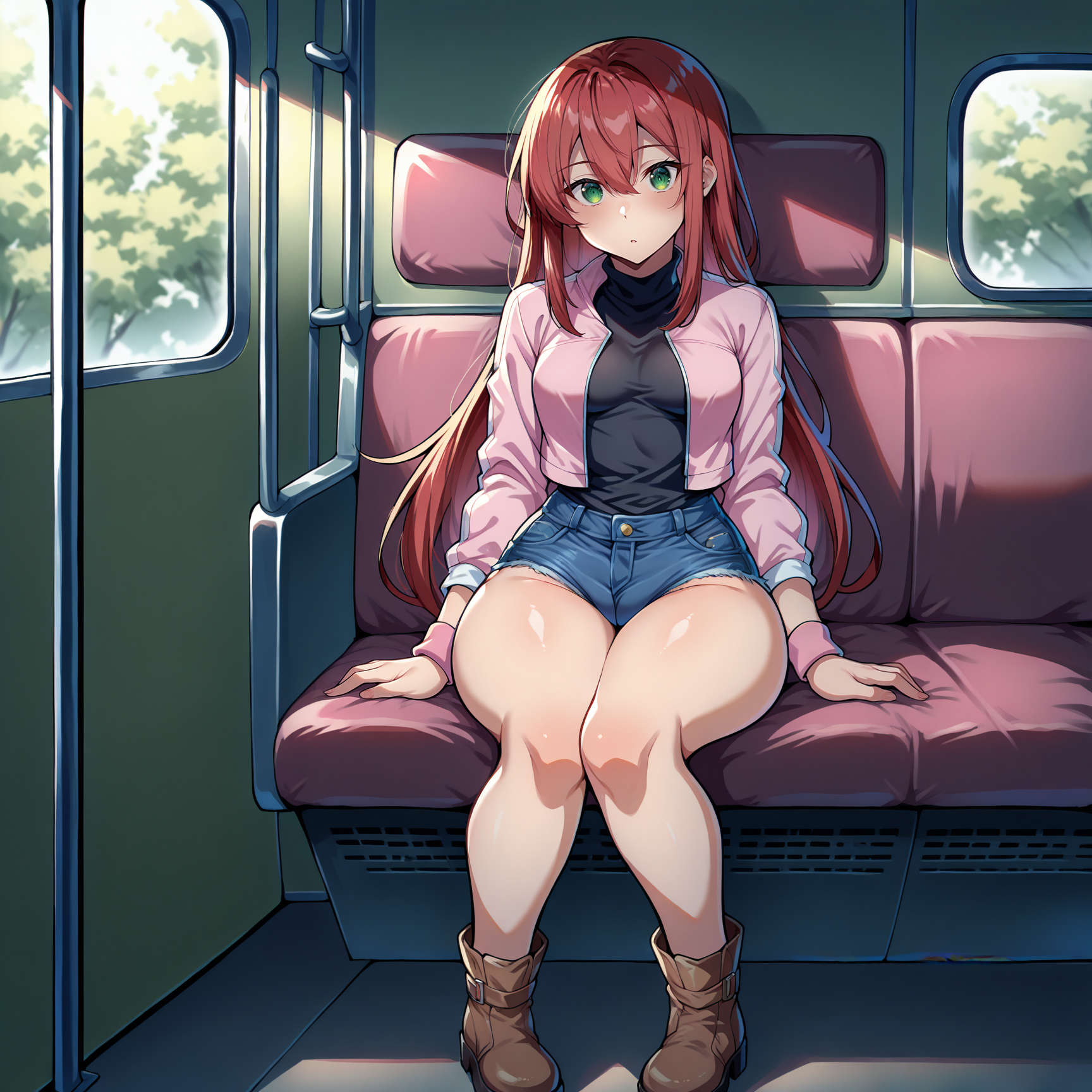black shirt, pink jacket, long sleeves, pink wristband, denim shorts, micro shorts, brown boots, ankle boots