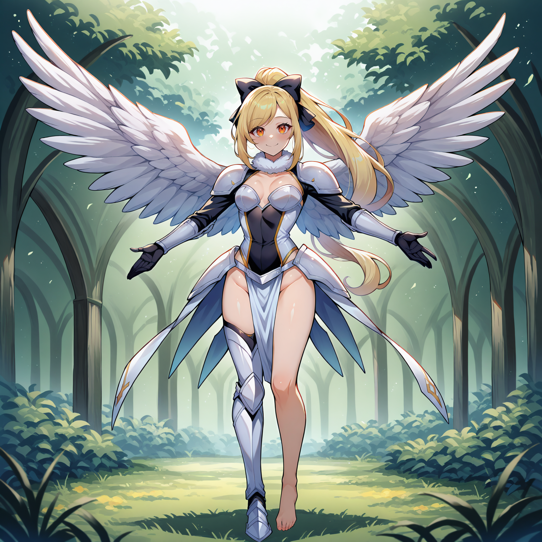1girl, solo, blonde hair, swept bangs, sidelocks, long hair, ponytail, angel wings, white wings, feathered wings, orange eyes