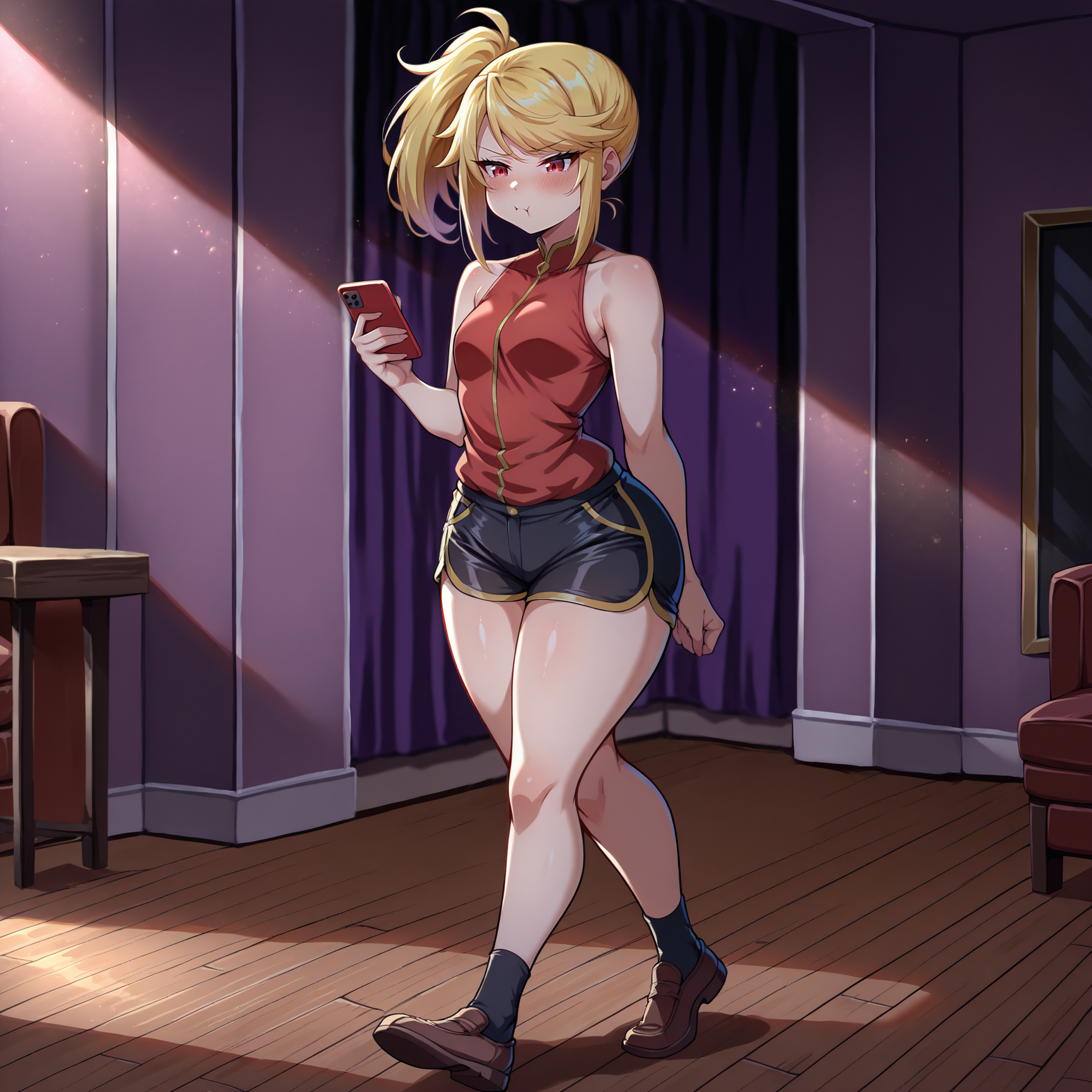 Outfit Prompts red shirt, sleeveless, black shorts, brown shoes, black socks, ankle socks, vampire, gold-trimmed shorts