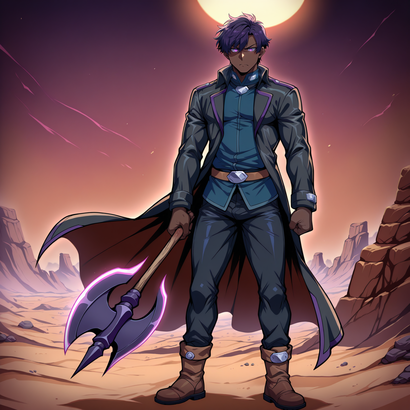 dark blue shirt, black long coat, dark purple trim, black pants, brown boots, ankle boots