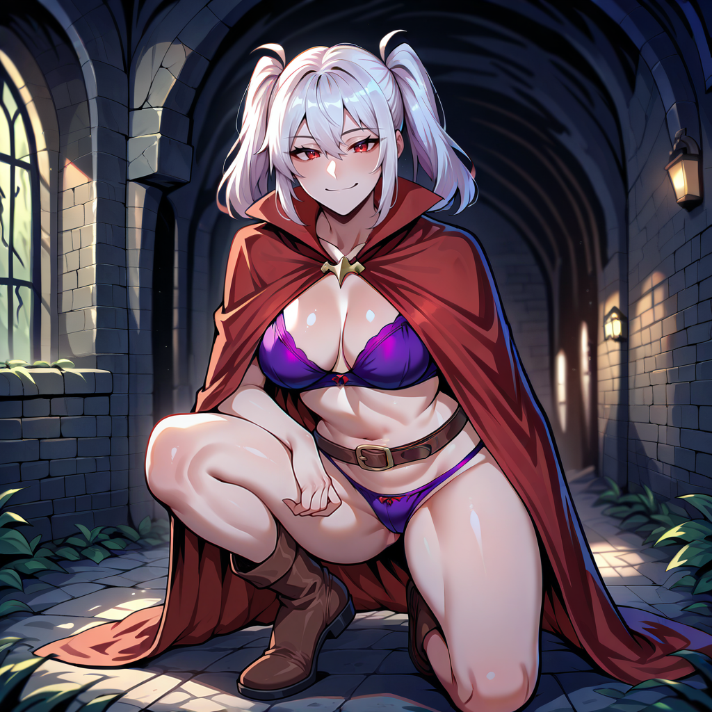 Outfit Prompts purple bra, purple panties, brown belt, brown boots, red cape, swimsuit