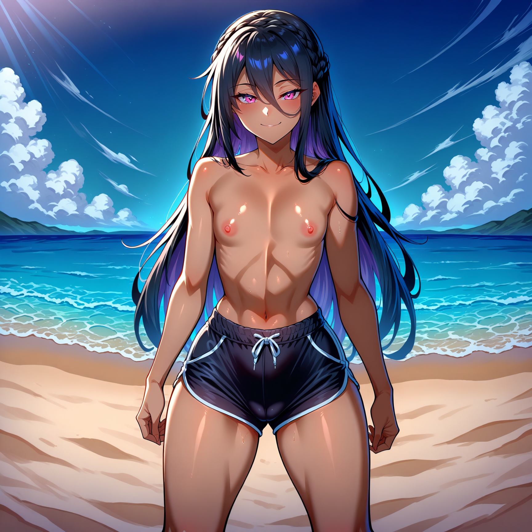 Outfit Prompts topless, nipples, black shorts, swimsuit