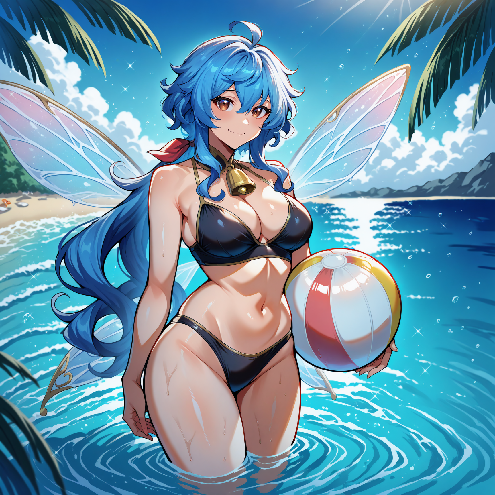 1girl, solo, (ganyu \(genshin impact\):0.1), blue hair, hair between eyes, sidelocks, wavy hair, ponytail, low ponytail, (water wings, fairy wings:1.2), brown eyes