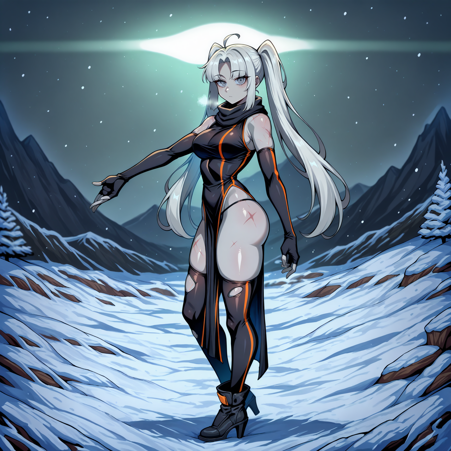 1girl, solo, white hair, parted bangs, blunt bangs, sidelocks, ahoge, straight hair, long hair, twintails, zombie, scars all over, grey eyes, (light grey skin:1.2)