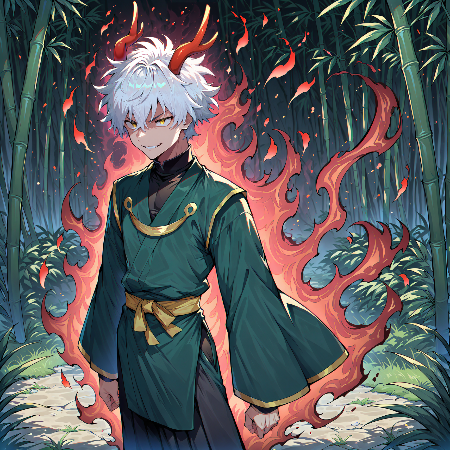 1boy, solo, male focus, (white hair:1.5), short hair, disheveled hair, messy hair, golden eyes,(eastern dragon horns:1.5), red horns, young