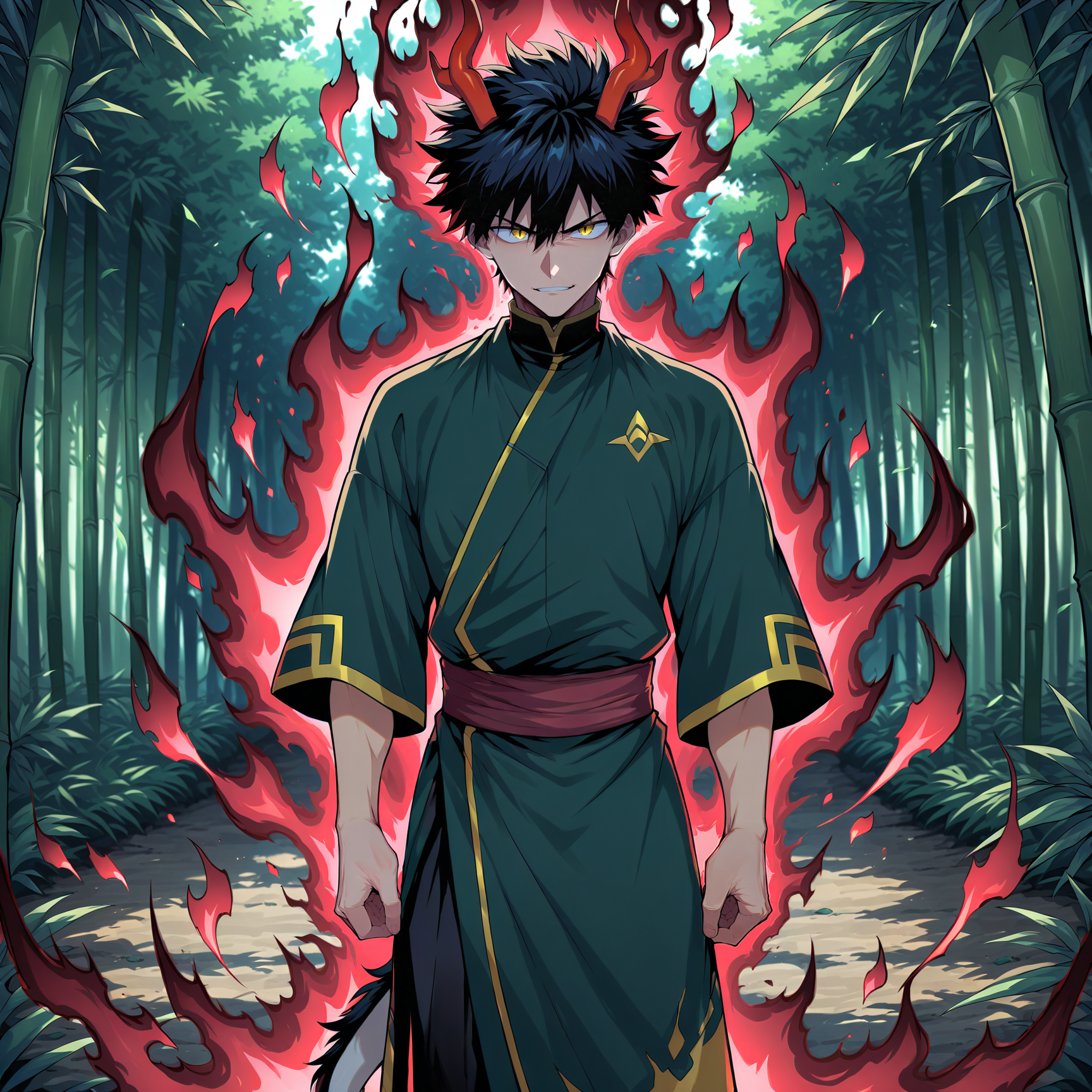 1boy, solo, male focus, sinewy, (black hair:1.5), short hair, disheveled hair, messy hair, spiked hair, golden eyes,(eastern dragon horns:1.3), lion tail, red horns
