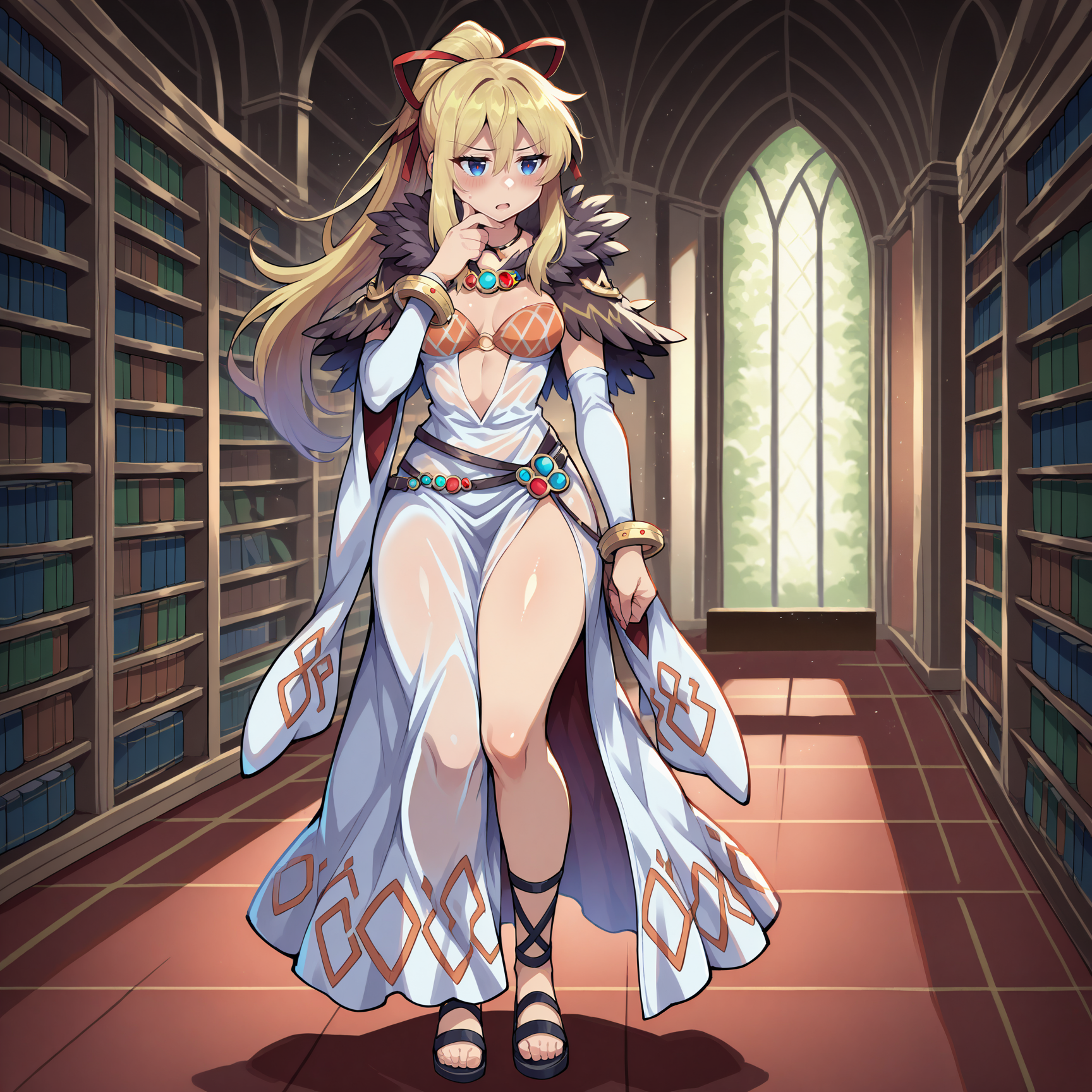 sorcerer \(ragnarok online\), hair ribbon, red ribbon, feather trim, jewelry, necklace, black fur collar, sleeveless dress, white dress, argyle clothes, translucent dress, side slit, orange bra, frilled bra, lace-up bra, white sleeves, elbow sleeves, bangle, white panties, black sandals
