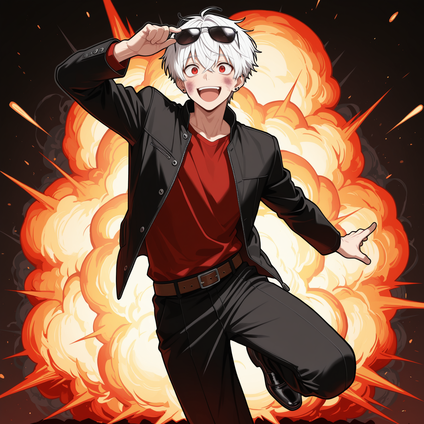 black jacket, red shirt, black pants, belt, black monk shoes, sunglasses on head,