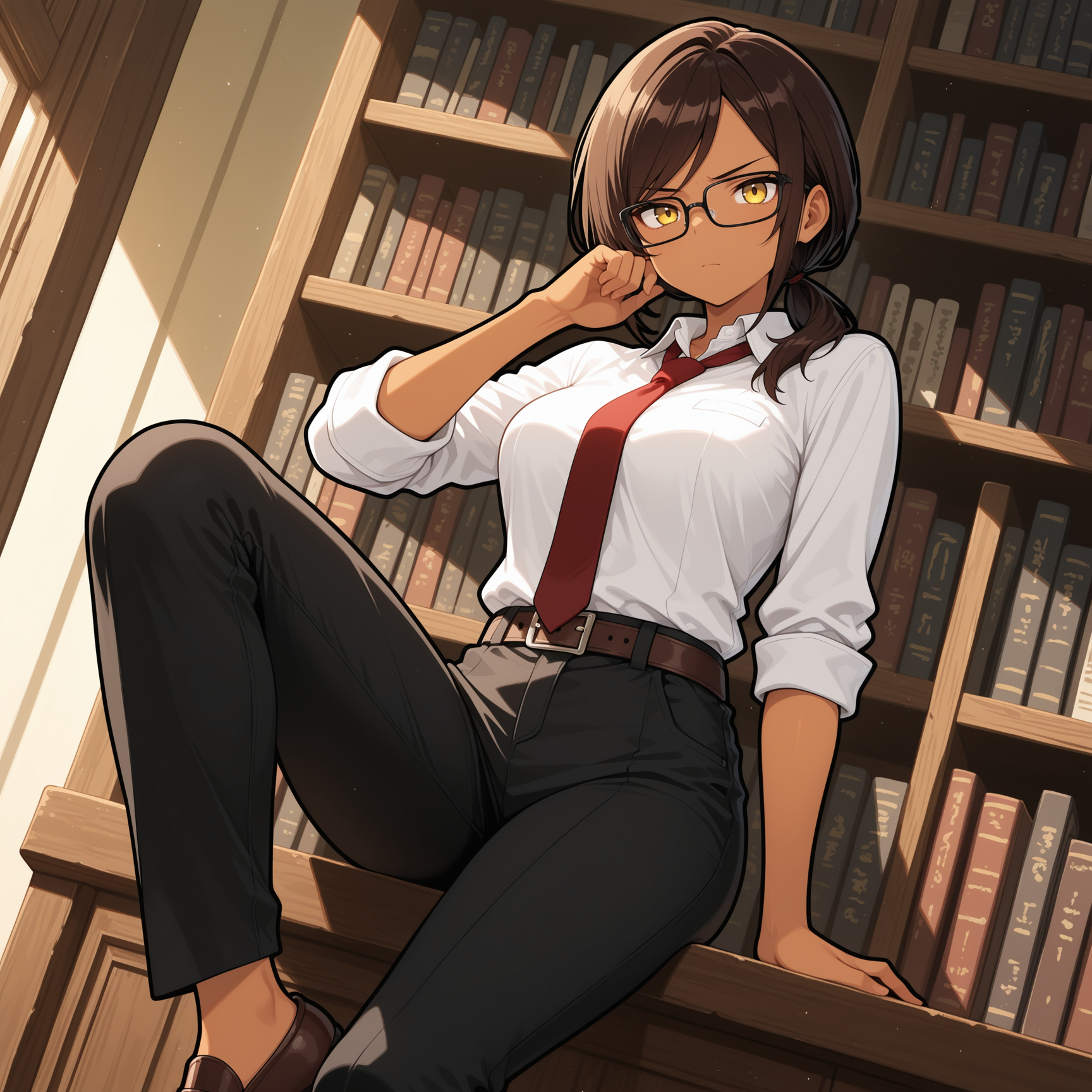 brown hair, medium hair, low ponytail, yellow eyes, tan, swept bangs, medium breasts,