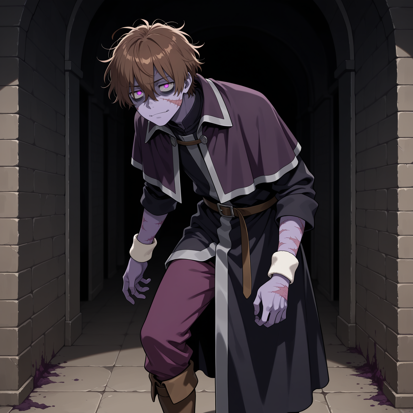 1boy, solo, mature male, bags under eyes, brown hair, hair between eyes, messy hair, short hair, purple eyes, glowing eyes, rotting, zombie, purple skin, multiple scars:1.2,