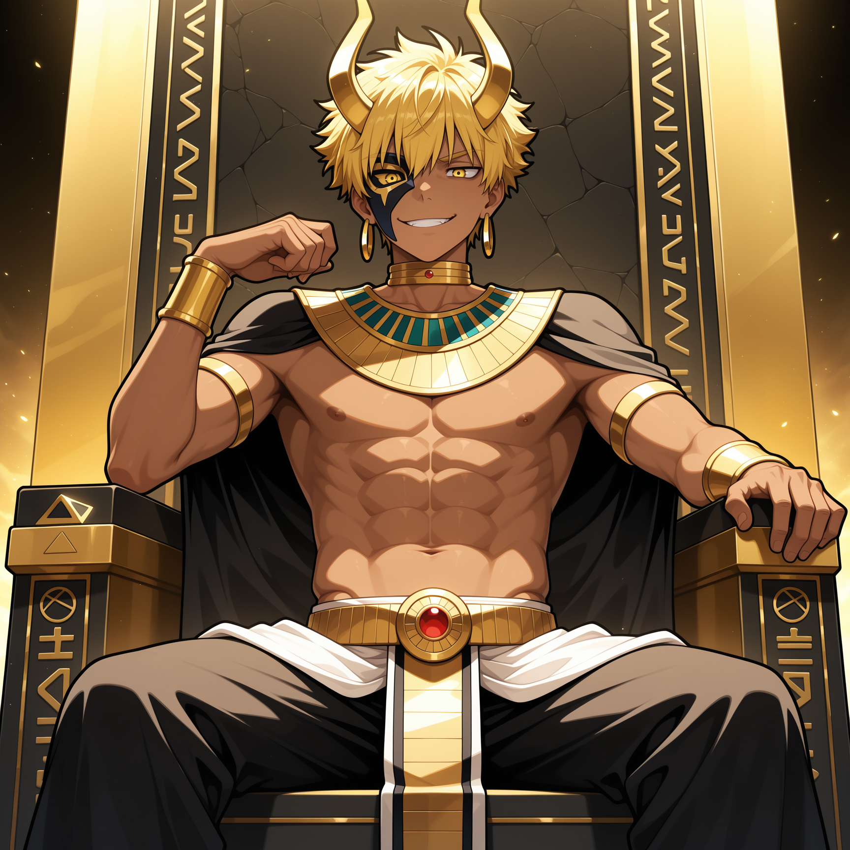1boy, solo, adult face, male focus, yellow hair, short hair, brown skin, wispy bangs, yellow eyes, demon horns, abs,