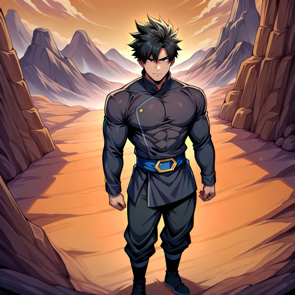 Physical Prompts 1boy, solo, black hair, spiked hair, (goku black:0.4), swept bangs, black eyes, single sidelock, dark skin