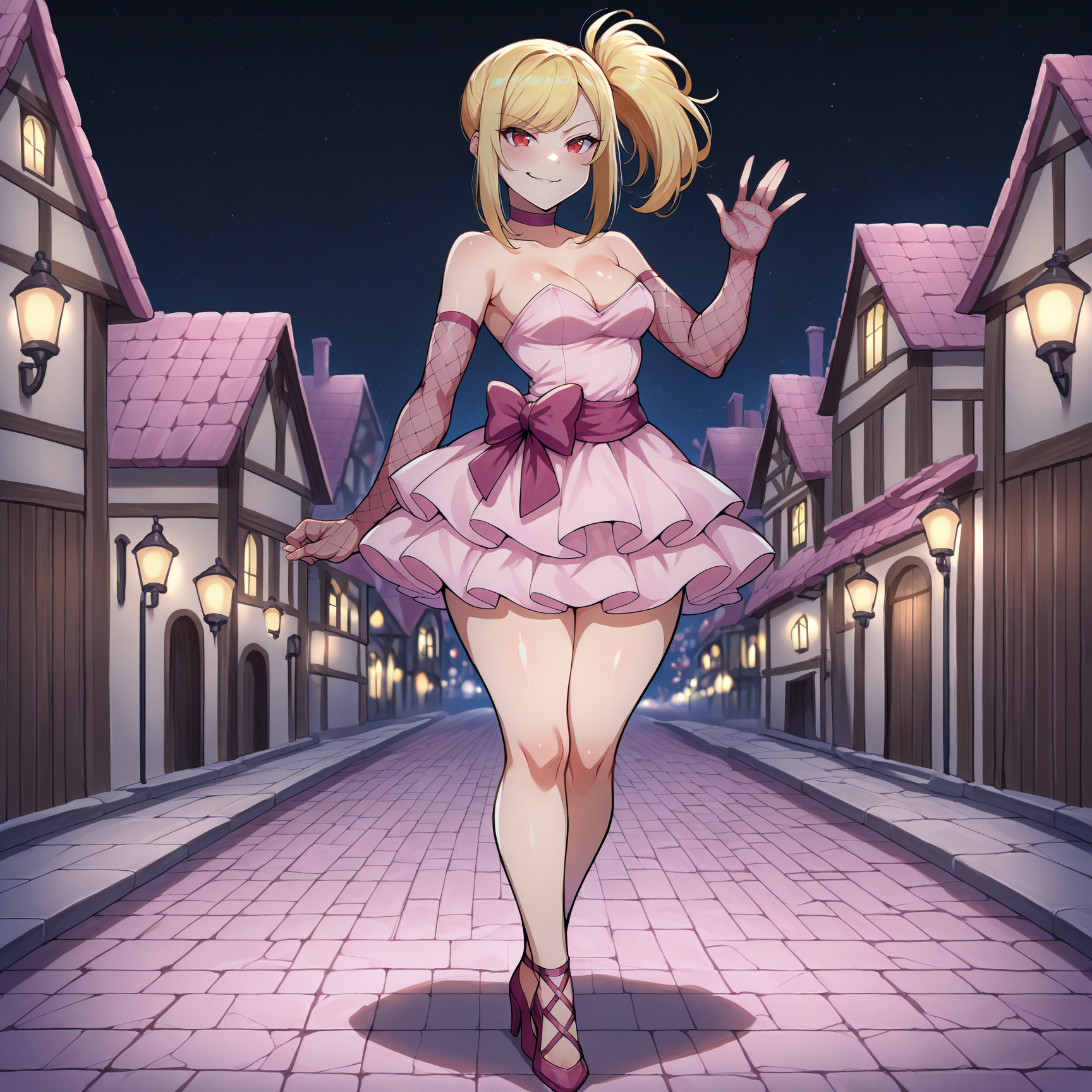 Outfit Prompts dark pink choker, strapless dress, light pink dress, dark pink sash, layered dress, asymmetrical dress, sleeveless, cleavage, short dress, fishnet gloves, elbow gloves, fingerless gloves, dark pink high heels, lace-up heels