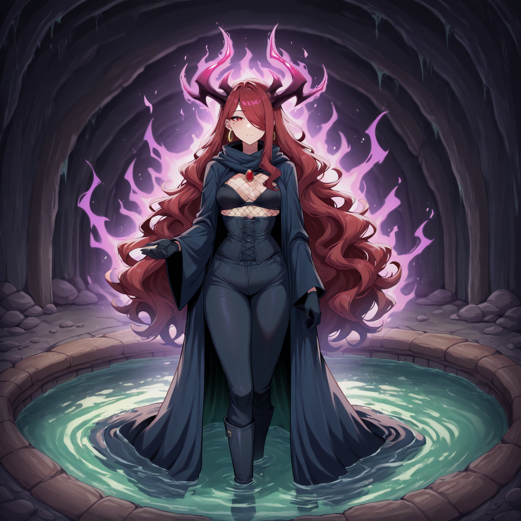1girl, solo, red hair, very long hair, sidelocks, hair over one eye, disheveled, wavy hair, red eyes, mature female,(dark energy horns:1.3)