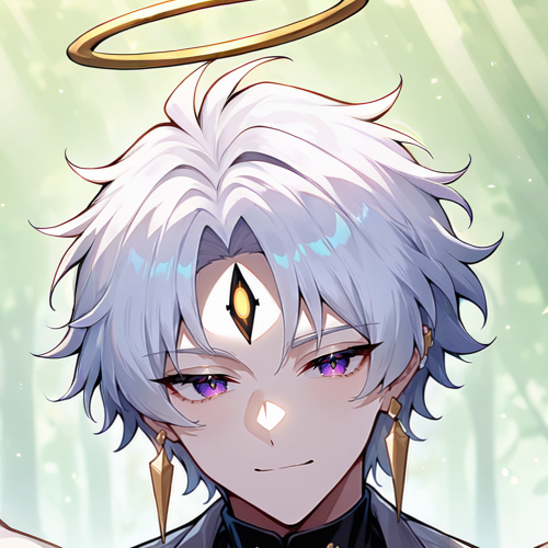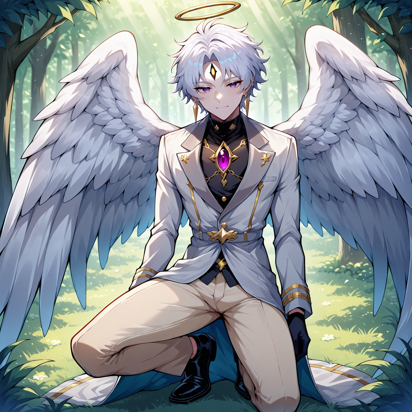1boy, solo,male focus, white hair, short hair, pale skin, purple eyes, Sinewy,pointy ears, third eye, angel wings