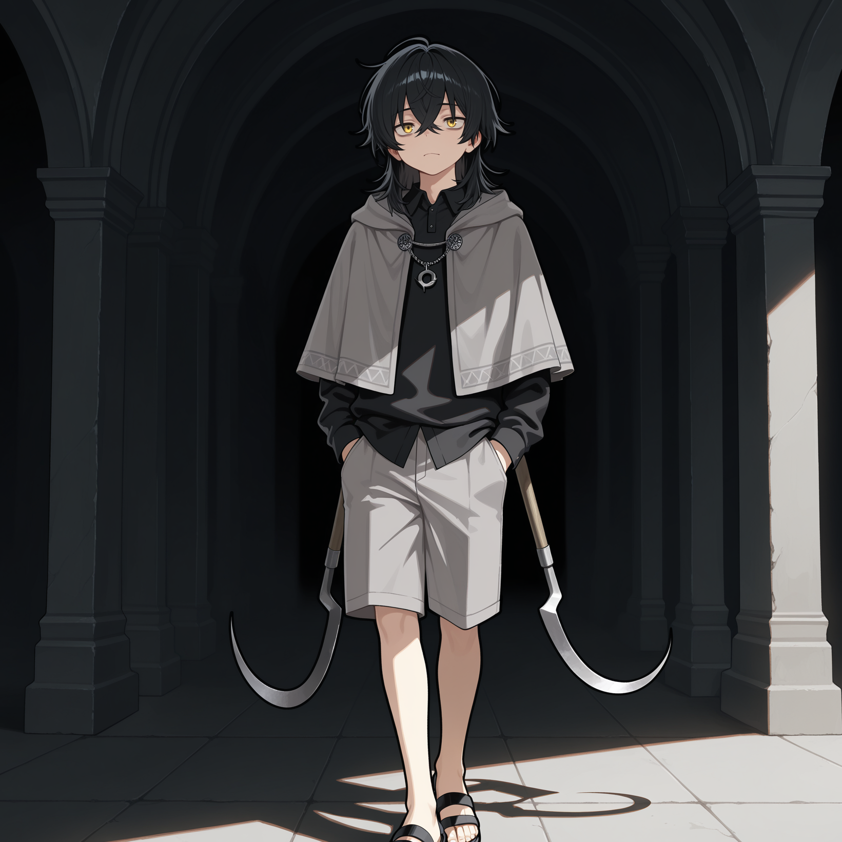 black shirt, collared shirt, grey shorts, black sandals, sickle, dual weapons, grey capelet,
