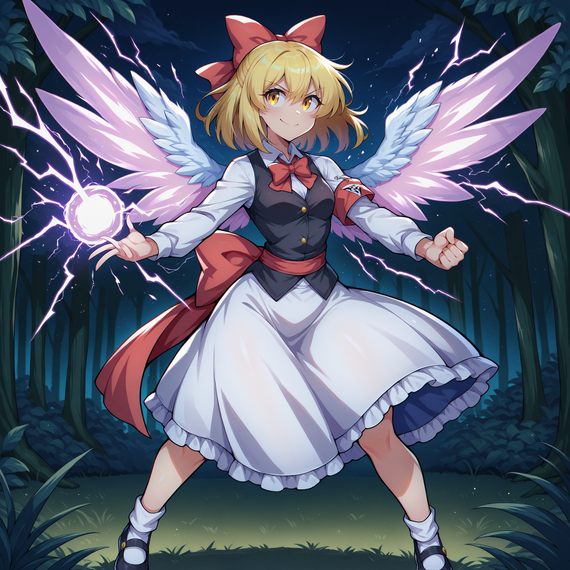 red bow, hair bow, large bow, white shirt, collared shirt, black vest, bowtie, long sleeves, red armband, red sash, huge bow, belt bow, white-frilled skirt, medium skirt, black shoes, white socks
