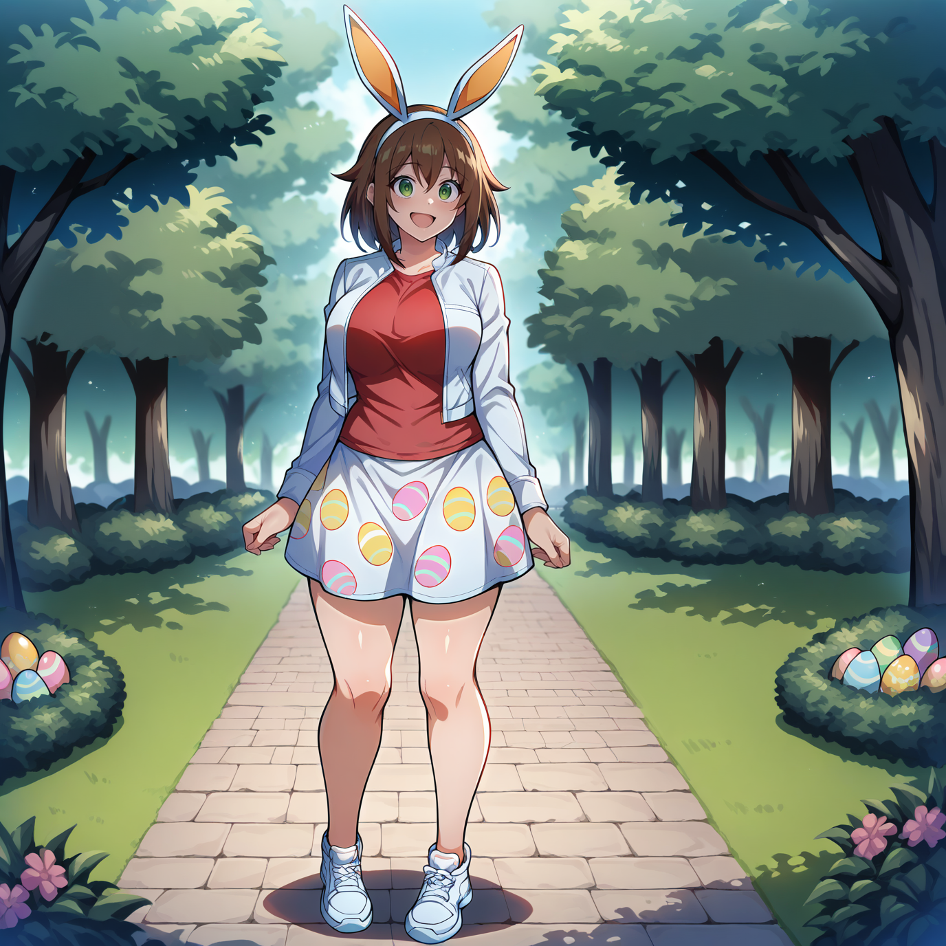 Outfit Prompts red rabbit ear, fake animal ears, easter bunny \(cosplay\), rabbit tail, red shirt, egg print, rabbit print, white jacket, white skirt, white shoes