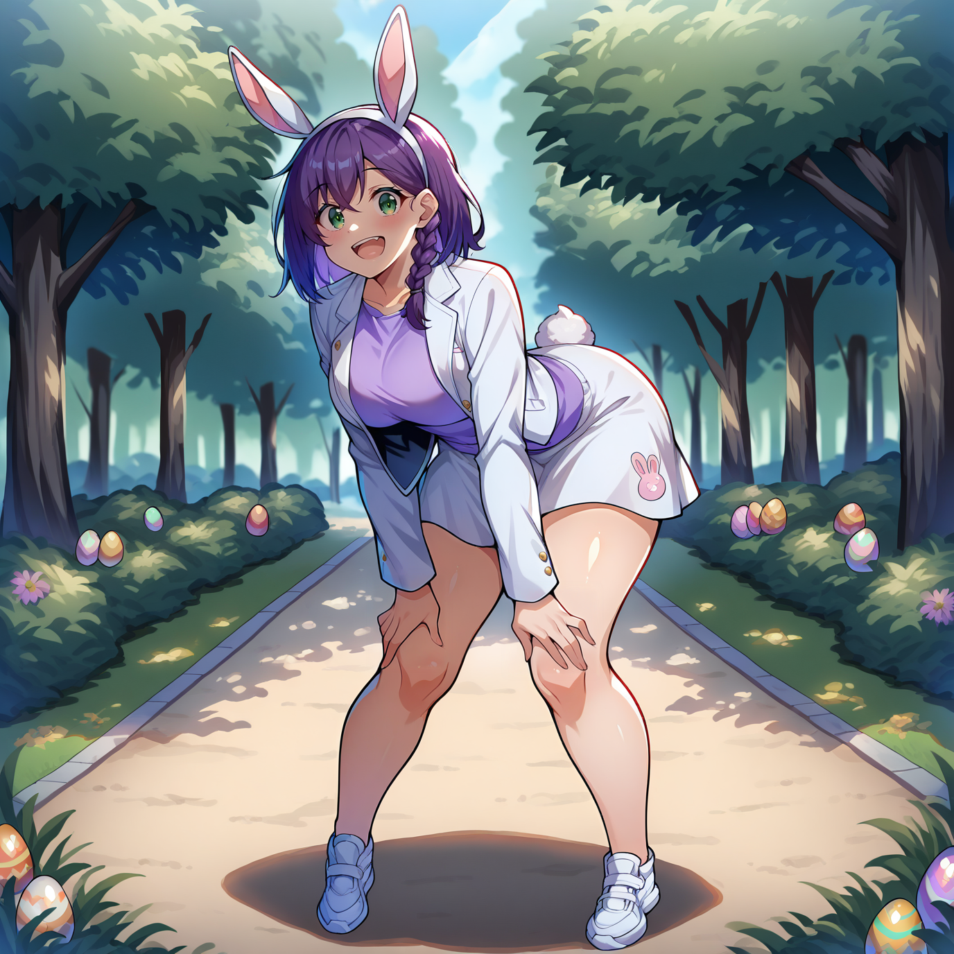 purple rabbit ear, fake animal ears, easter bunny \(cosplay\), rabbit tail, purple shirt, egg print, rabbit print, white jacket, white skirt, white shoes