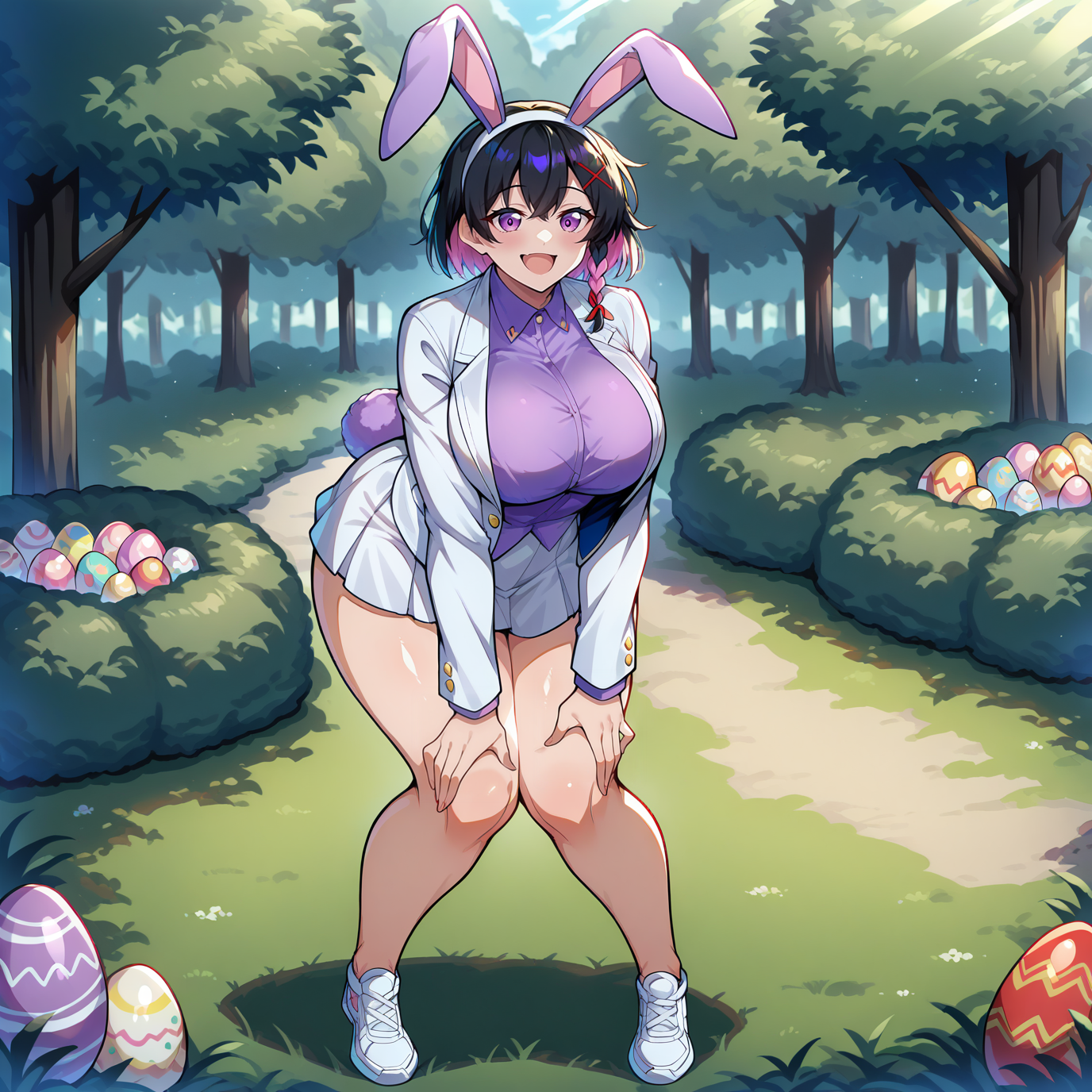 red x hair ornament, purple rabbit ear, fake animal ears, easter bunny \(cosplay\), rabbit tail, purple shirt, egg print, rabbit print, white jacket, white skirt, white shoes