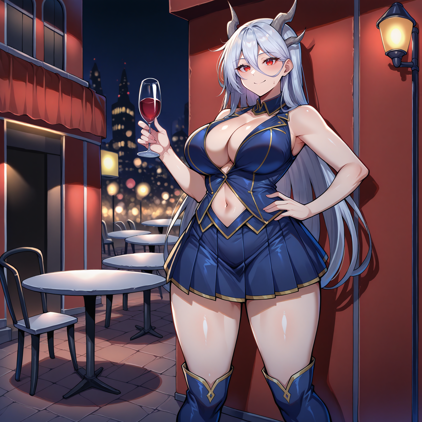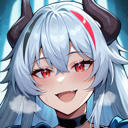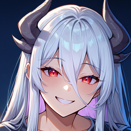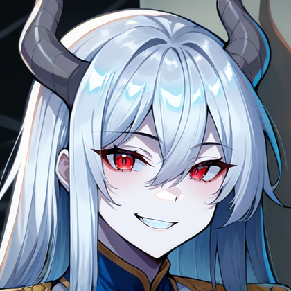 Physical Prompts 1girl, solo, white hair, hair between eyes, long hair, straight hair, horns, dragon horns, dark grey horns, red eyes