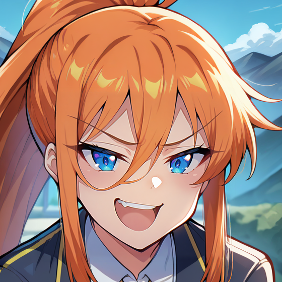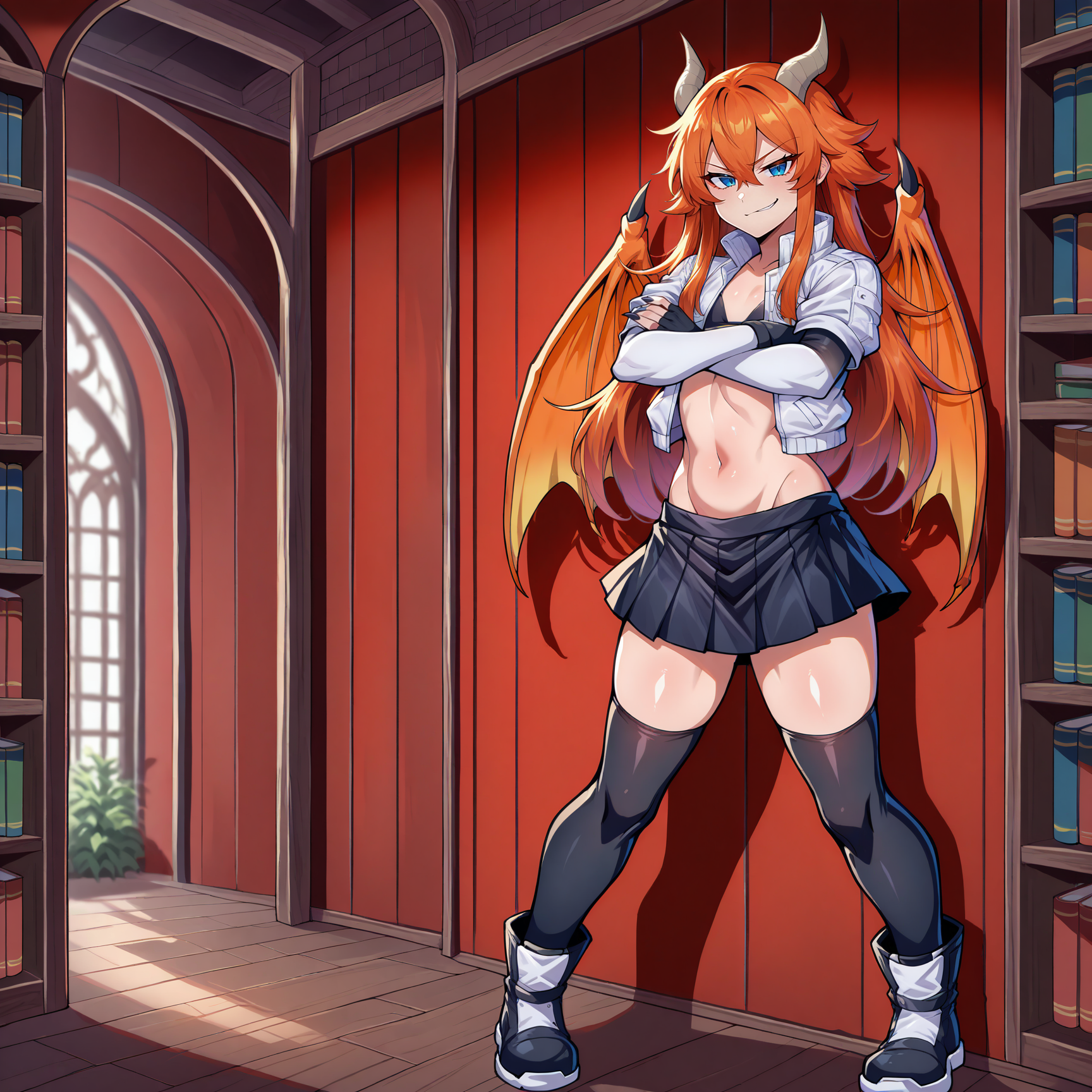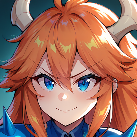 Physical Prompts 1girl, solo, orange hair, hair between eyes, sidelocks, long hair, disheveled hair, black claws, claws, horns, dragon horns, dark gray horns, wings, dragon wings, orange wings, blue eyes