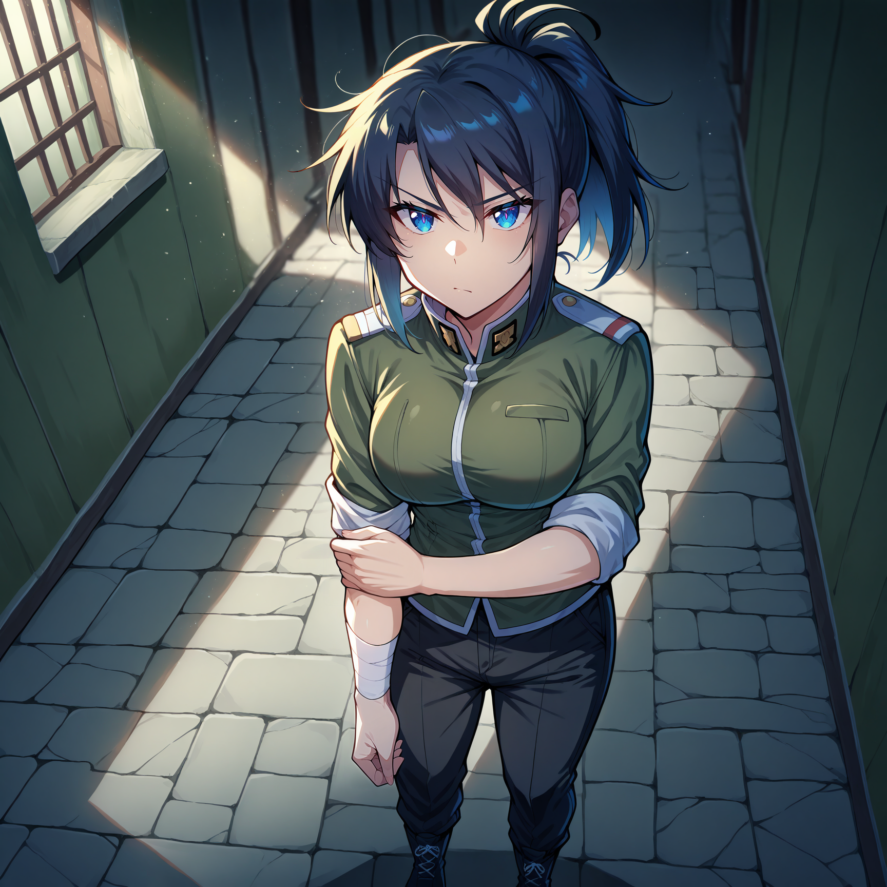 Outfit Prompts military uniform, bandages, sarashi, bandaged leg, bandaged arm, black pants, green jacket, black boots