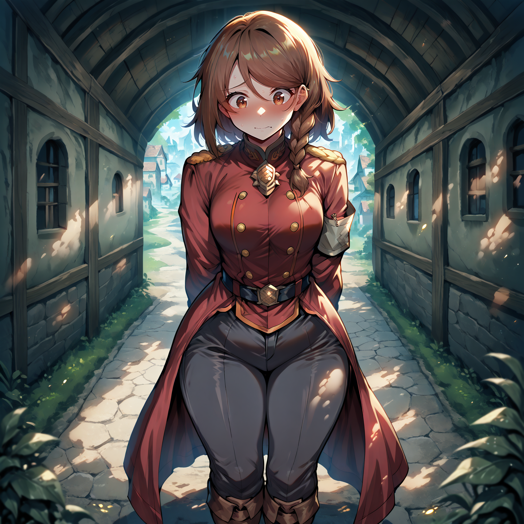 Outfit Prompts red coat, closed coat, orange trim, gold epaulettes, grey armband, black belt, dark grey pants, brown boots