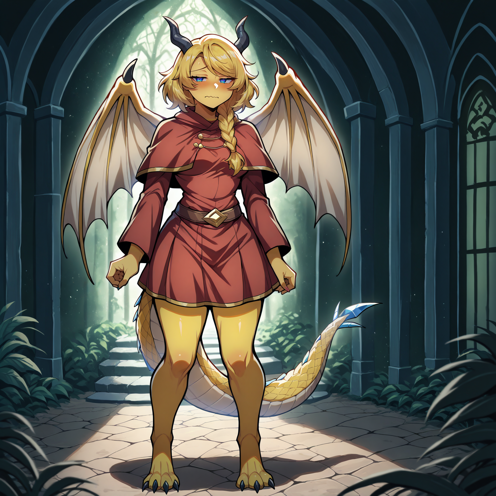 Physical Prompts 1girl, solo, gold hair, medium hair, single braid, front braid, swept bangs, dragon horns, dark grey horns, animal feet, black claws, (yellow skin:1.3), dragon girl, dragon tail, dragon wings, slit pupils, scales, yellow scales, blue scales, blue stripes, dark blue eyes