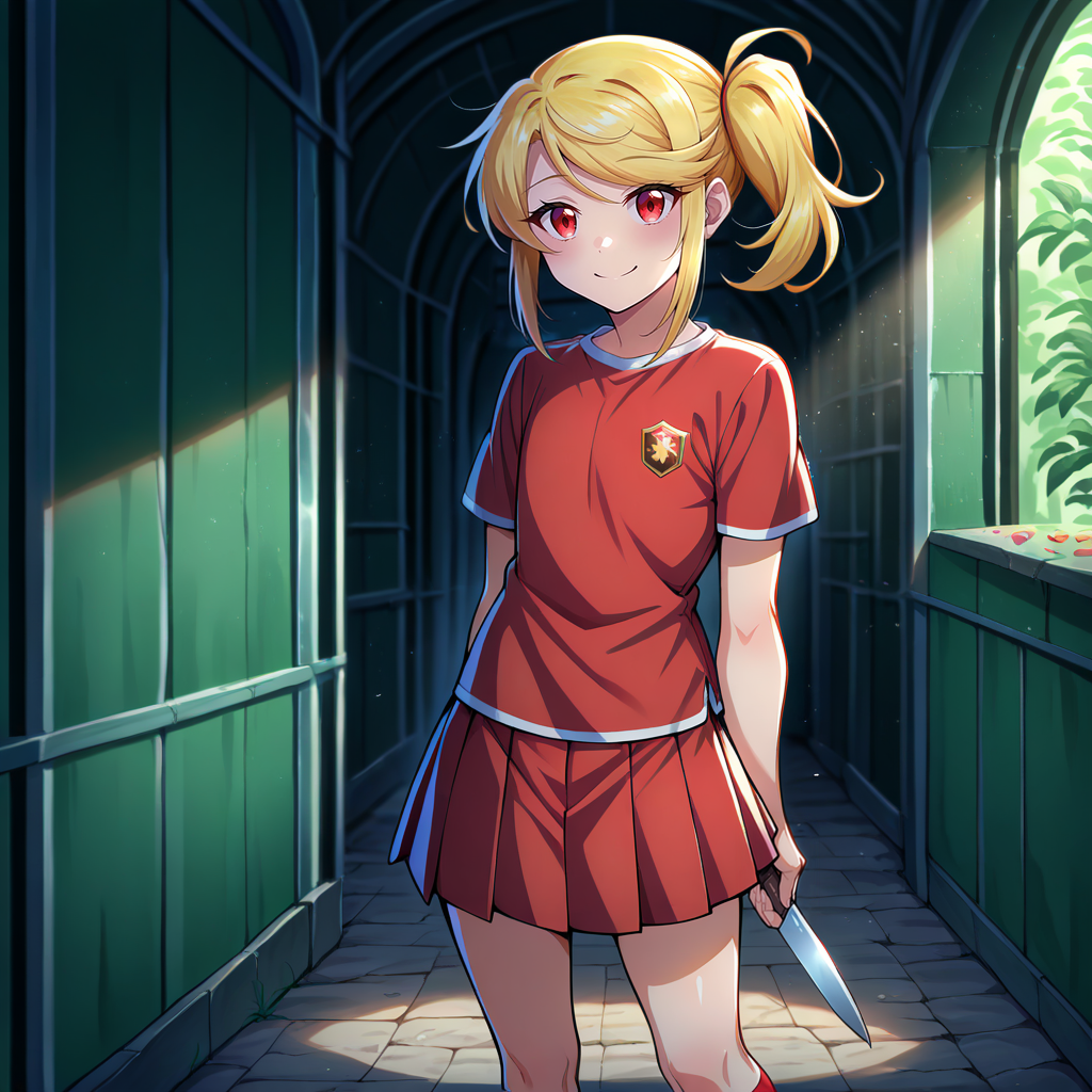 Physical Prompts 1girl, solo, gold hair, swept bangs, medium hair, sidelocks, side ponytail, red eyes
