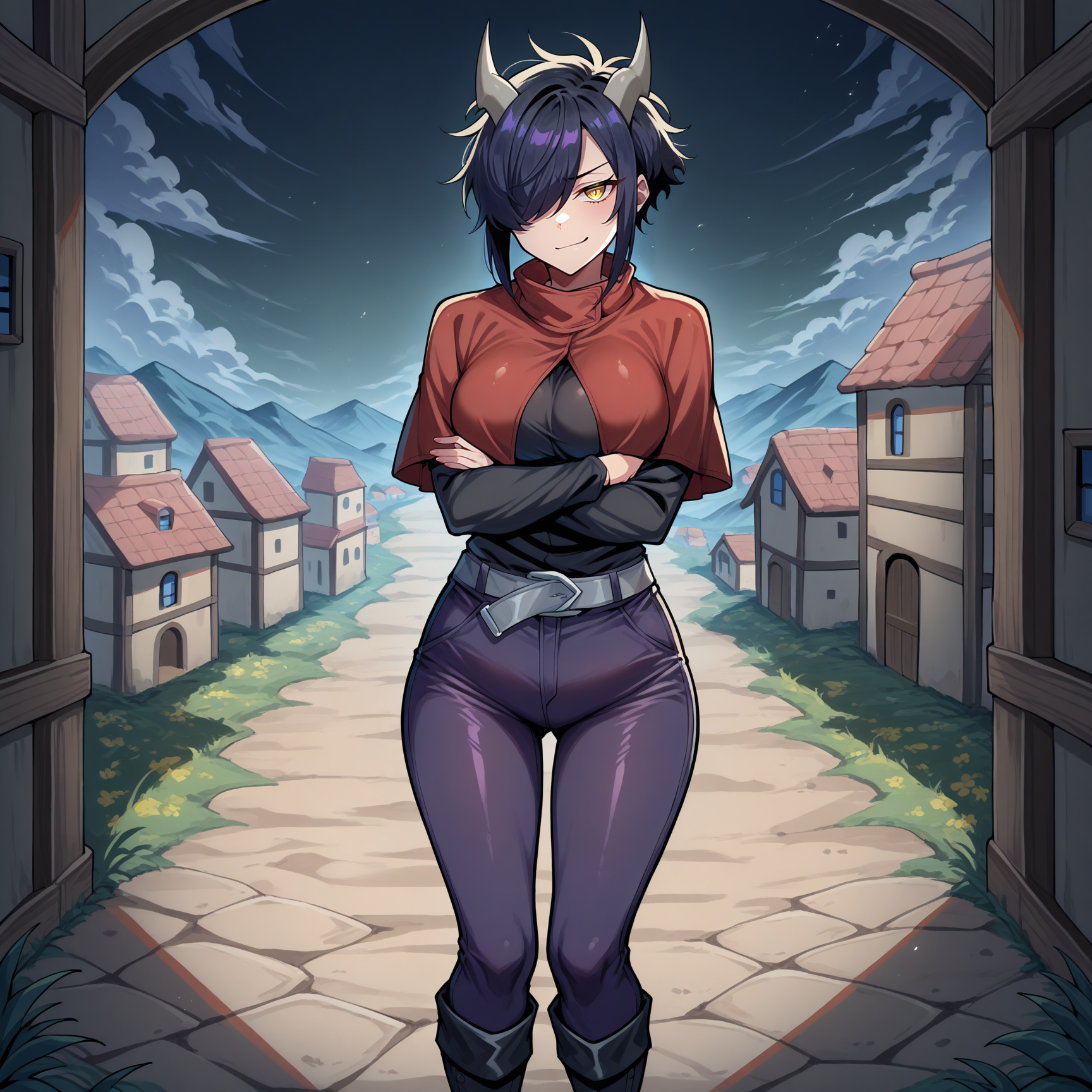 Outfit Prompts black shirt, red capelet, long sleeves, black sleeves, dark purple pants, gray belt, black boots