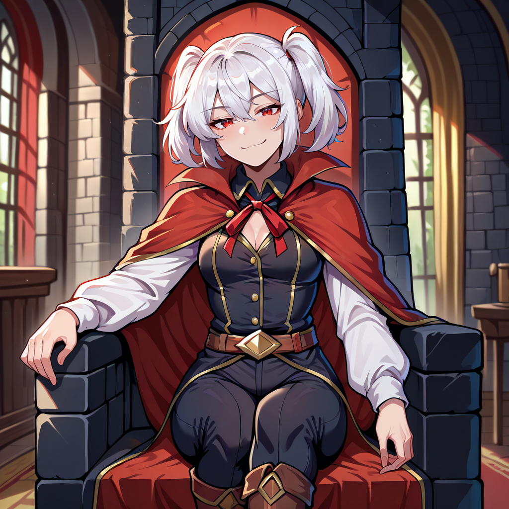 Physical Prompts 1girl, solo, white hair, twintails, bangs, hair between eyes, short hair, red eyes, vampire