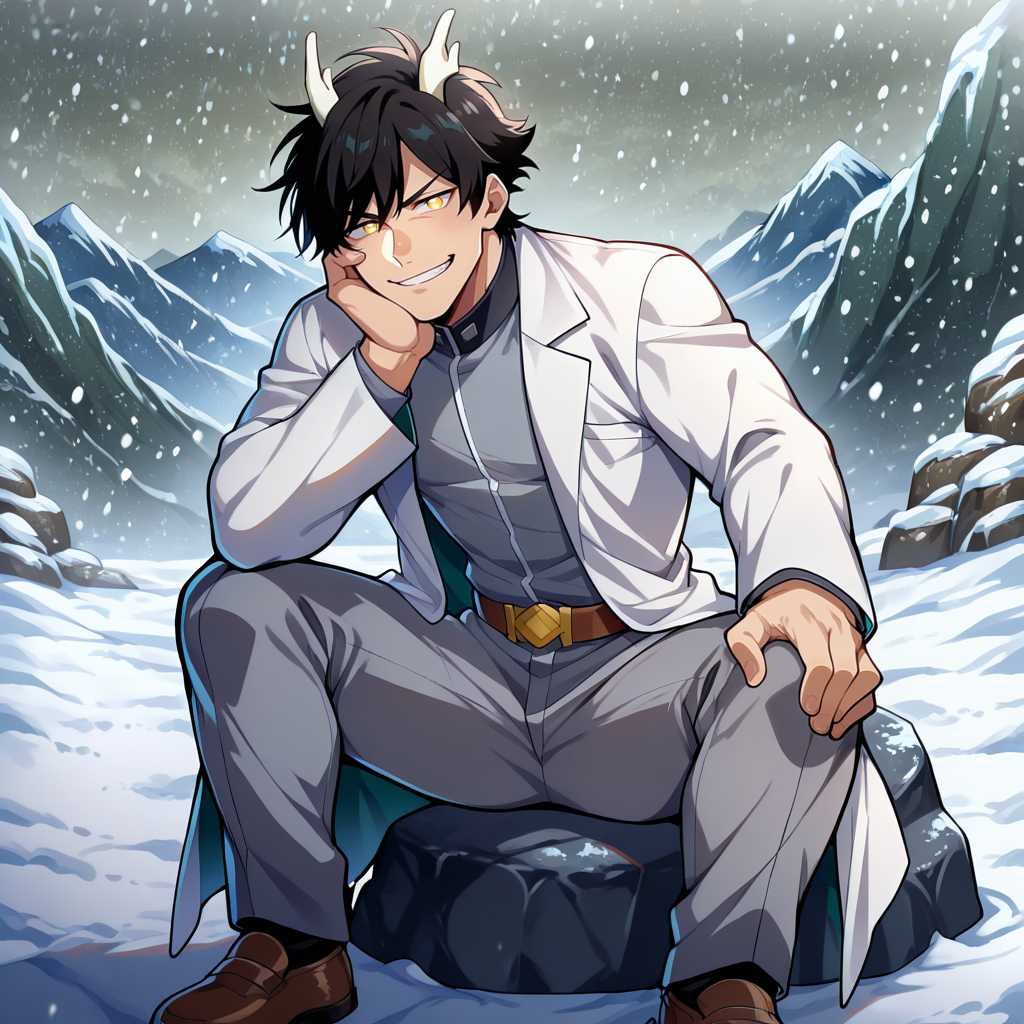 Physical Prompts 1boy, solo, <lora:male_solo_focus-000009:1>, male focus, black hair, messy hair, short hair, hair between eyes, swept bangs, bangs, gray horns, dragon horns, horns, muscular male, light yellow eyes