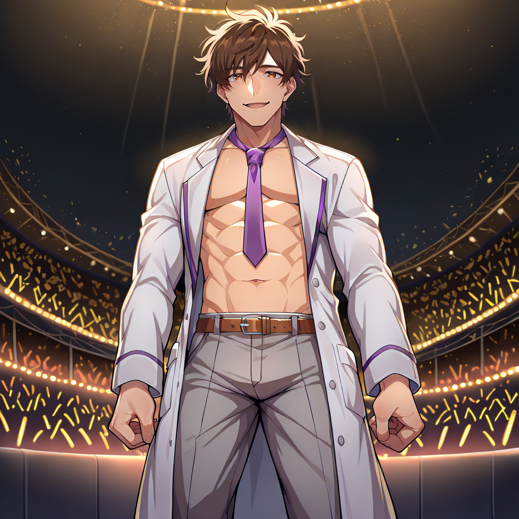 Outfit Prompts white coat, no shirt, long sleeves, gray pants, (purple tie:1.2), brown belt, brown shoes, doctor, navel