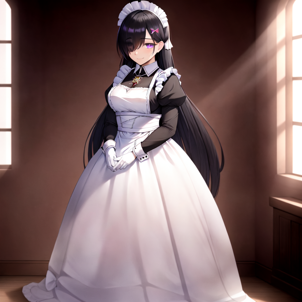 maid, maid headdress, maid apron, long dress, black dress, black sleeves, white wrist cuffs, brown gloves, leather gloves, pendant, white bow, hair bow