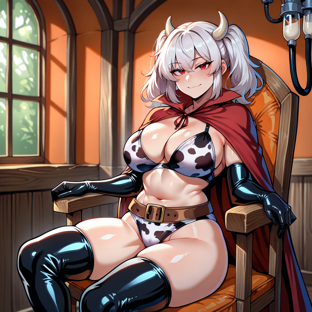 Outfit Prompts cowprint bra, cowprint panties, cowprint thighhighs, brown belt, latex boots, red cape, swimsuit, cow horns, latex gloves, elbow gloves, thigh boots