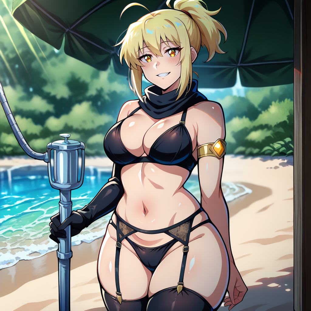 Outfit Prompts black tie, hair tie, bangs, sidelocks, black scarf, black bra, black panties, swimsuit, black glove, single glove, elbow glovs, gold armband, garter belt, black thighhighs, barefoot, navel