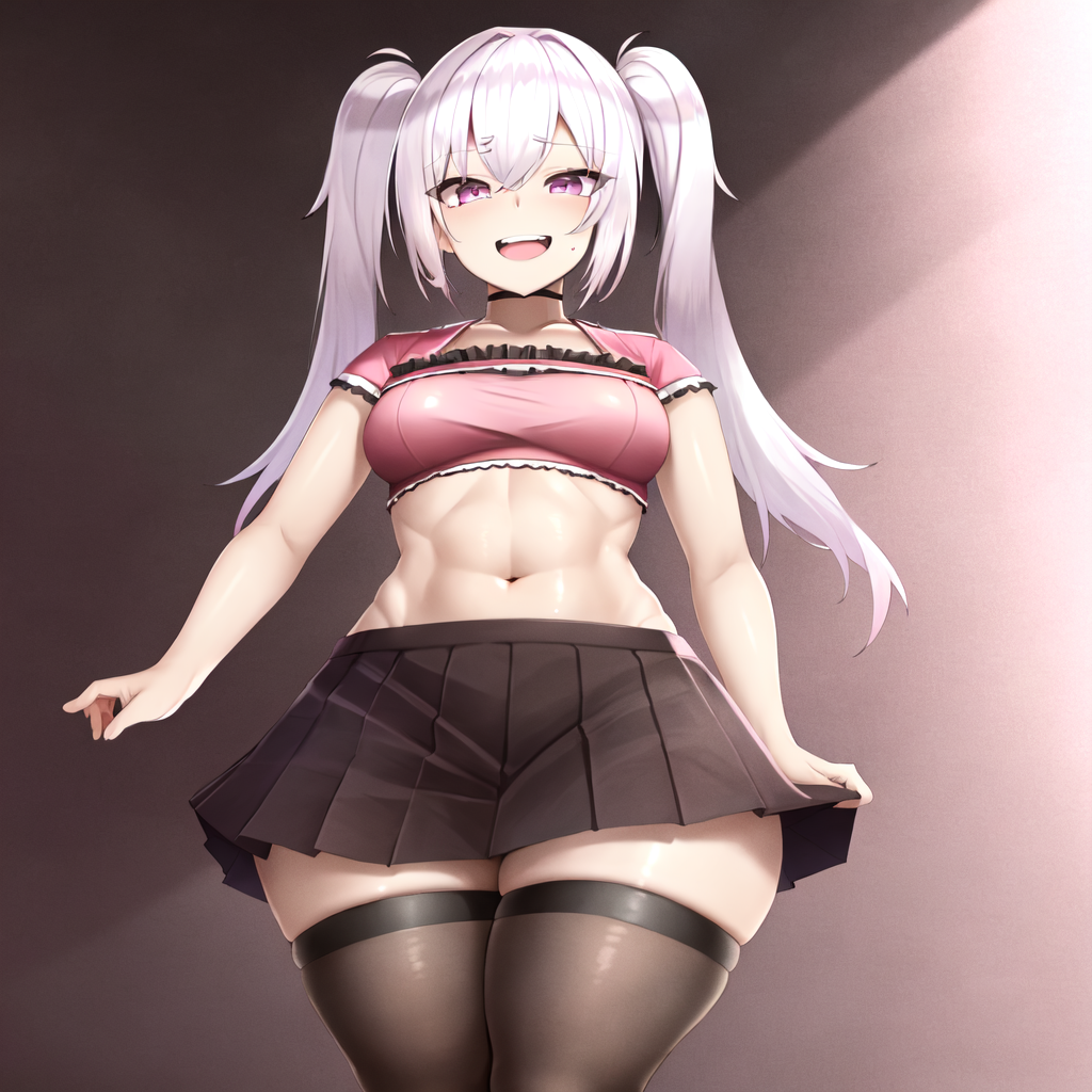 pink crop top, navel, short sleeves, black wristwatch, black skirt, pleated skirt, miniskirt, zettai ryouiki, black thighhighs, brown boots