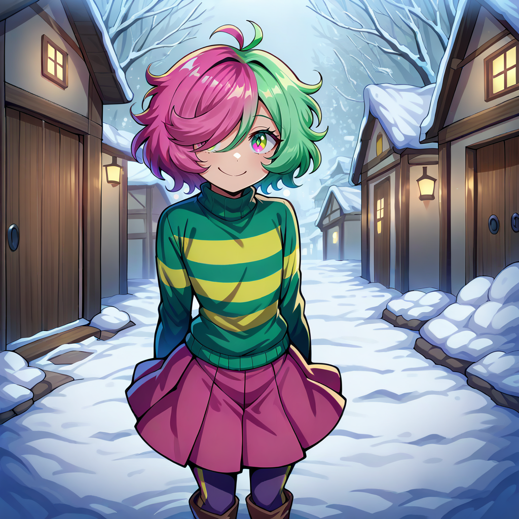 Outfit Prompts green sweater, single horizontal stripe, striped sweater, magenta stripe, magenta skirt, pleated skirt, miniskirt, pants under skirt, magenta pants, tight pants, brown boots