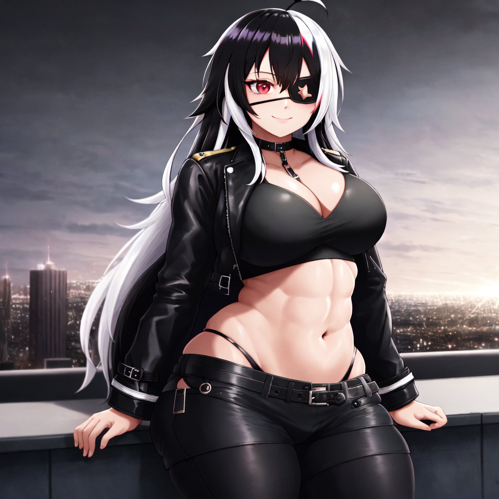 1girl, solo, muscular female, red eyes, eyepatch, pirate, black hair, white hair, two-tone hair, half black hair and half white hair, red wrickles, long hair, hair between eyes, messy hair