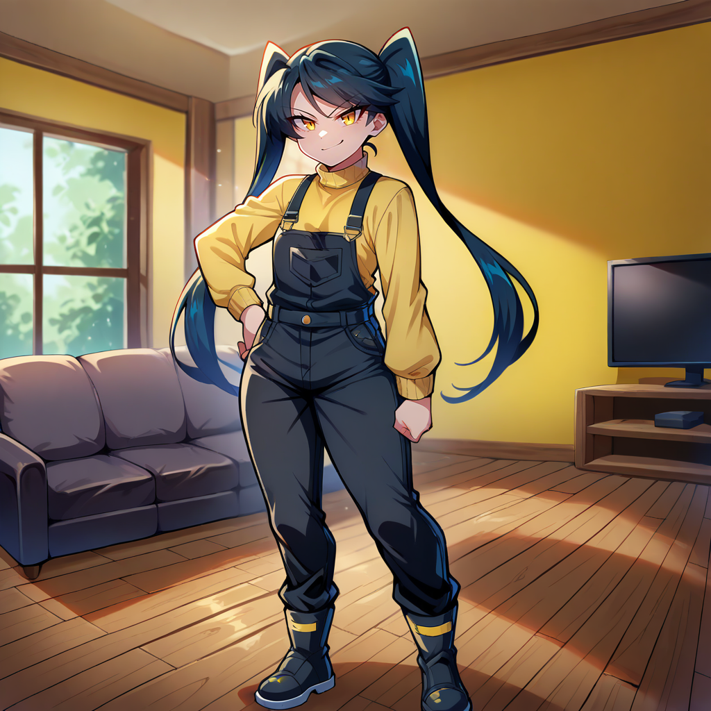 black overalls, black pants, (yellow sweater:1.3), black boots