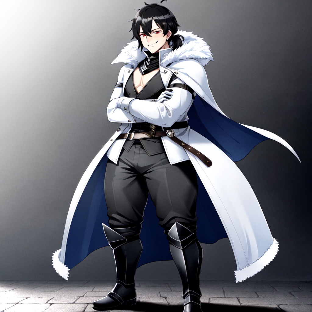 black mantle, white cape, black sleeves, long sleeves, white wrist cuffs, white gloves, fur coat, white fur, gray belt, belt bag, gray bag, black pants, black boots, armored boots