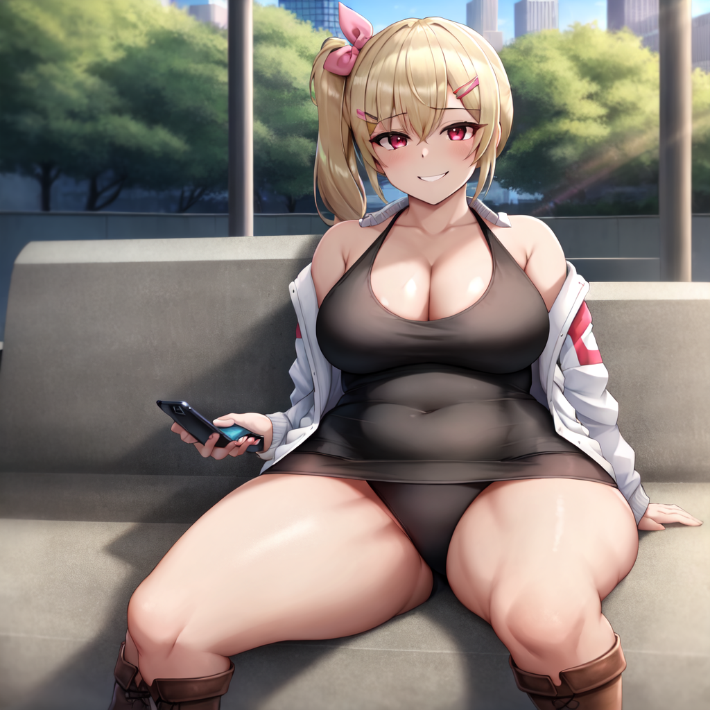 hair tie, hair bow, pink bow, white tank top, cleavage, sleeveless shirt, white jacket, open jacket, black panties, no pants, brown boots, knee boots