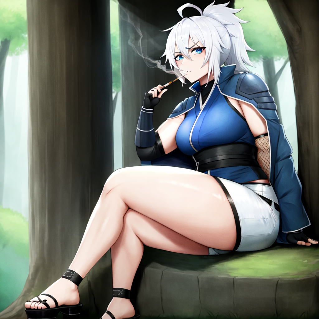 black bandana, blue gloves, fingerless gloves, elbow gloves, fishnet shirt, short sleeves, blue coat, open coat, sleeveless coat, white shorts, blue sandals, toes, ninja