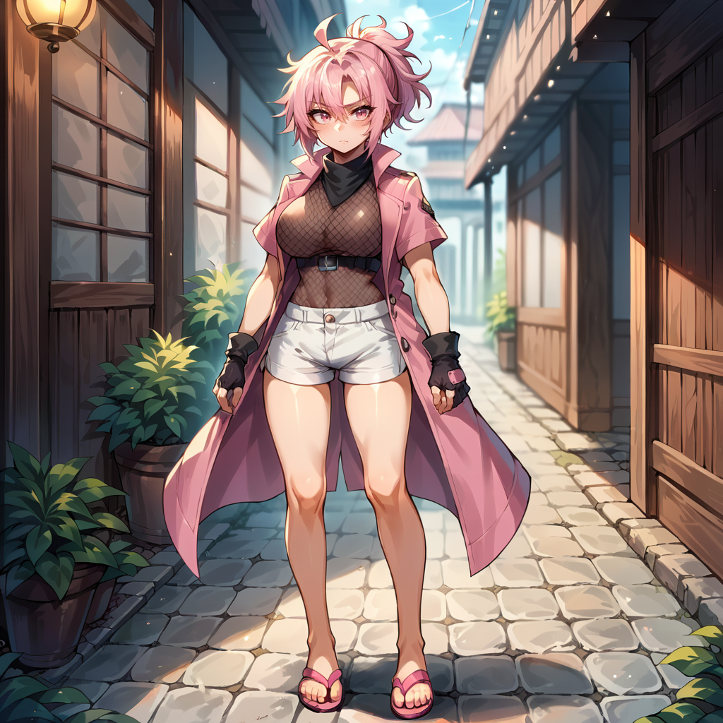 black bandana, dark pink gloves, fingerless gloves, elbow gloves, fishnet shirt, short sleeves, dark pink coat, open coat, sleeveless coat, white shorts, dark pink sandals, toes, ninja